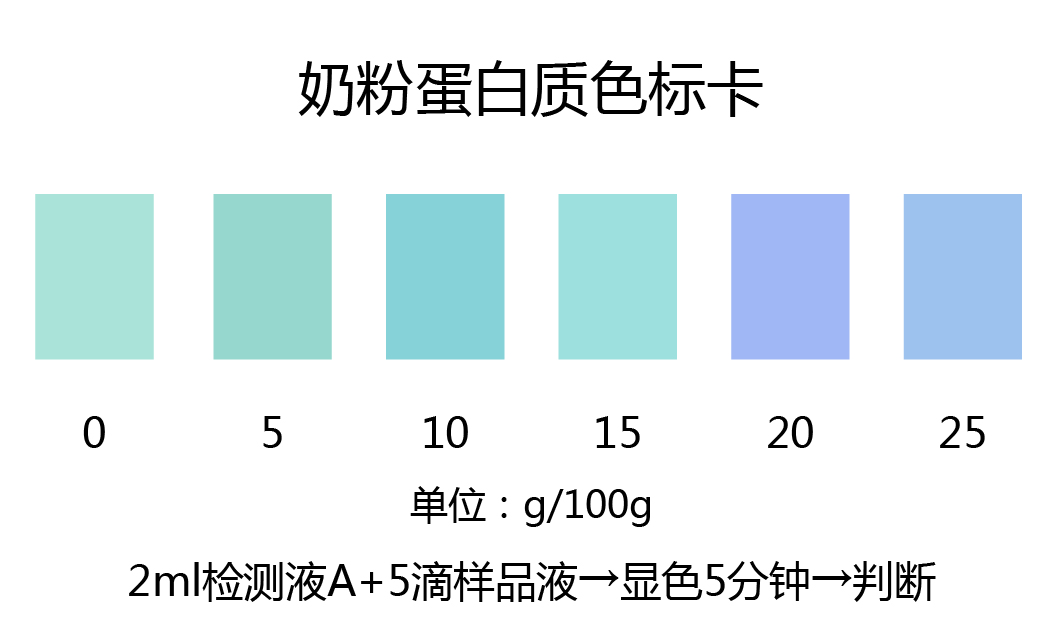 1.3:取2ml蛋白質檢測試劑于比色管中,加入5滴樣品液,振搖混勻5分鐘后,觀察顏色變化并與標準比色卡對比。