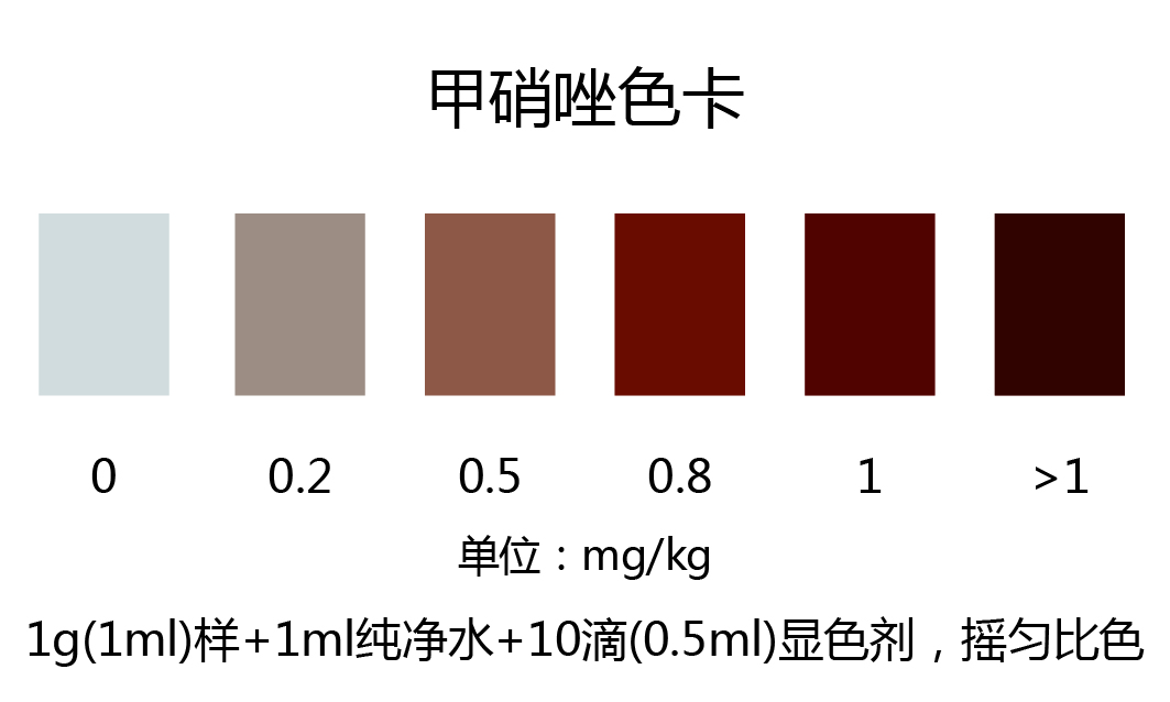 取1g(1ml)樣品于試管中,加入1ml純凈水,搖勻,加入10滴(0.5ml)檢測液,60±10℃水浴加熱2分鐘,取出后進(jìn)行比色,顏色越深,甲硝唑的含量越高。