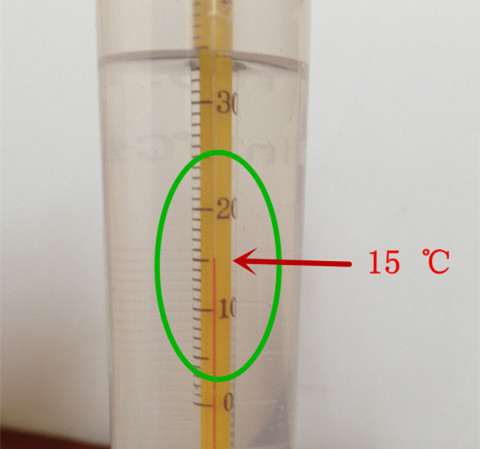 1.4:將溫度計放入量筒里不要貼筒壁,稍等片刻,目光平視看準讀數(下左圖為15℃);