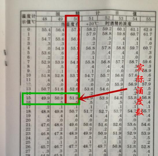 1.5:找到換算表,找到縱向酒度計讀數和橫向溫度計讀數對應的交叉值即為白酒實際酒精度(上右圖);